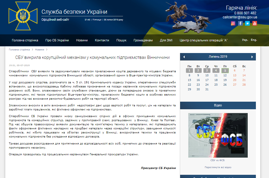 С сайта и Facebook-страницы Службы безопасности Украины исчезли сообщения о разоблачении преступной схемы, организованной одним из вице-премьер-министров страны, позволяющей чиновникам коммунальных предприятий Винницкой области присваивать государственные деньги.