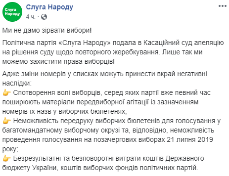 "Мы не дадим сорвать выборы! Политическая партия "Слуга народа" подала в Кассационный суд апелляцию на решение суда о повторной жеребьевке", - сказано в нем.