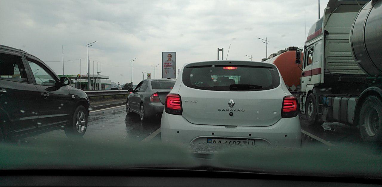 Южный мост Киева стоит в гигантских пробках даже по выходным. Фото очевидцев