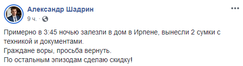 "Примерно в 3:45 залезли в дом, вынесли 2 сумки с техникой и документами. Граждане грабители, просьба вернуть. По остальным эпизодов сделаю скидку", - написал Шадрин.