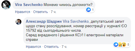 В комментарии к посту Шадрин указал, что в момент ограбления находился в доме и спал. В ответе сестре Надежды Савченко Вере Шадрин перечислил документы, которые похитили воры. При помощи приложения Fіnd My iPhone Шадрин обнаружил, что неизвестные успели удалить с компьютера 429 записей без возможности восстановления данных.