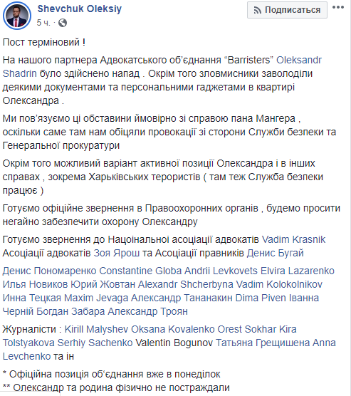 Адвокат Алексей Шевчук связывает нападение на дом коллеги по адвокатскому объединению "Barristers" с профессиональной деятельностью Шадрина. "Мы связываем эти обстоятельства, вероятно, с делом господина Мангера. Там нам обещали провокации со стороны Службы безопасности и Генеральной прокуратуры", - заявил Шевчук.