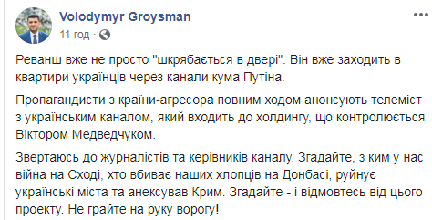 Обращаюсь к журналистам и руководителям канала. Вспомните, с кем у нас война на Востоке, кто убивает наших ребят на Донбассе, разрушает украинские города и аннексировал Крым. Вспомните - и откажитесь от этого проекта. Не играйте на руку врагу", - заявил премьер-министр.