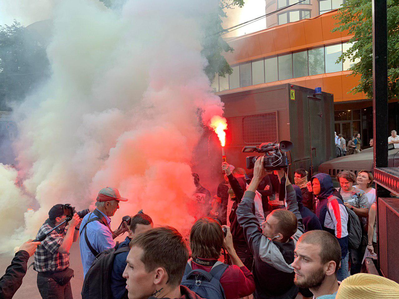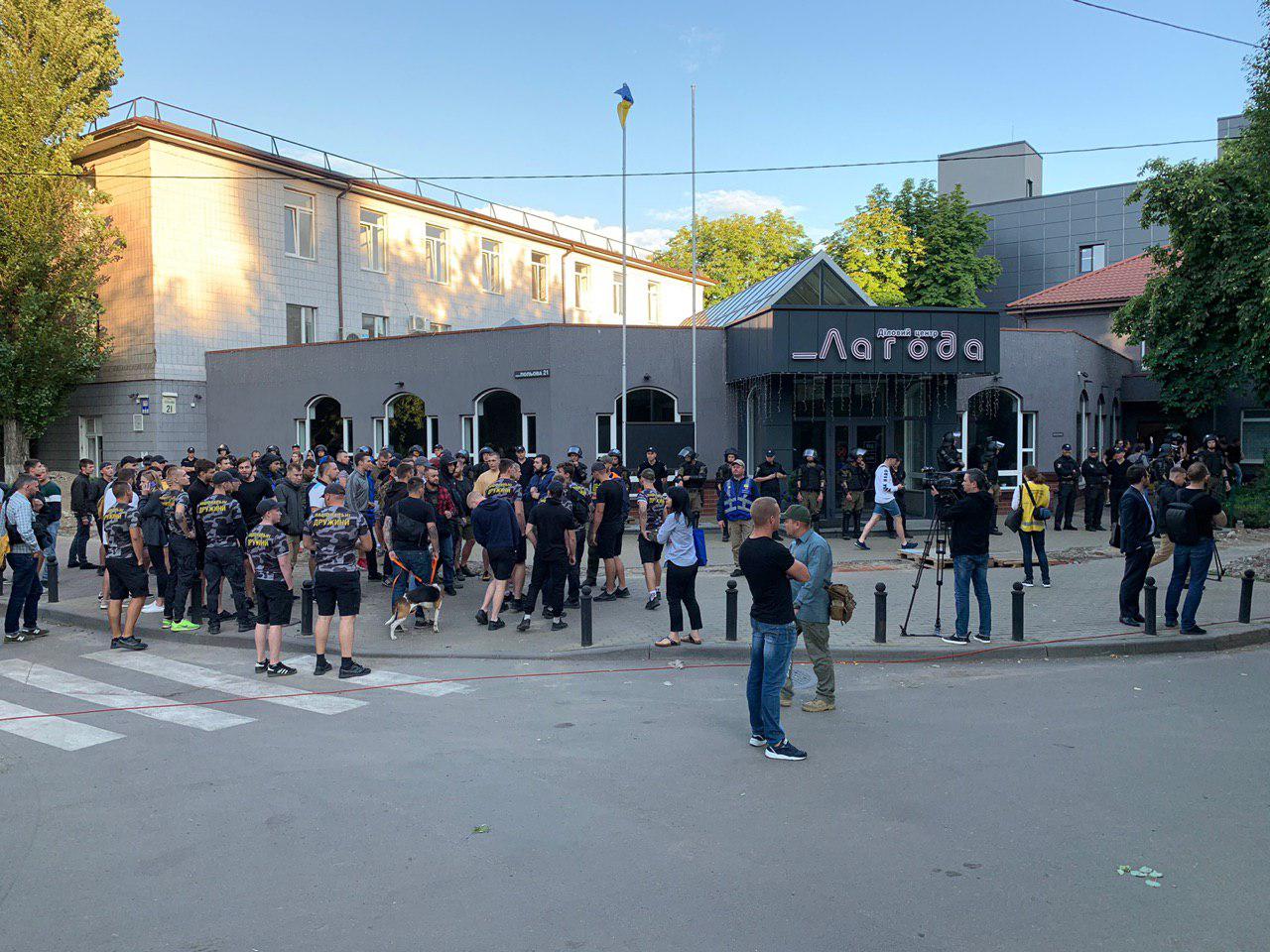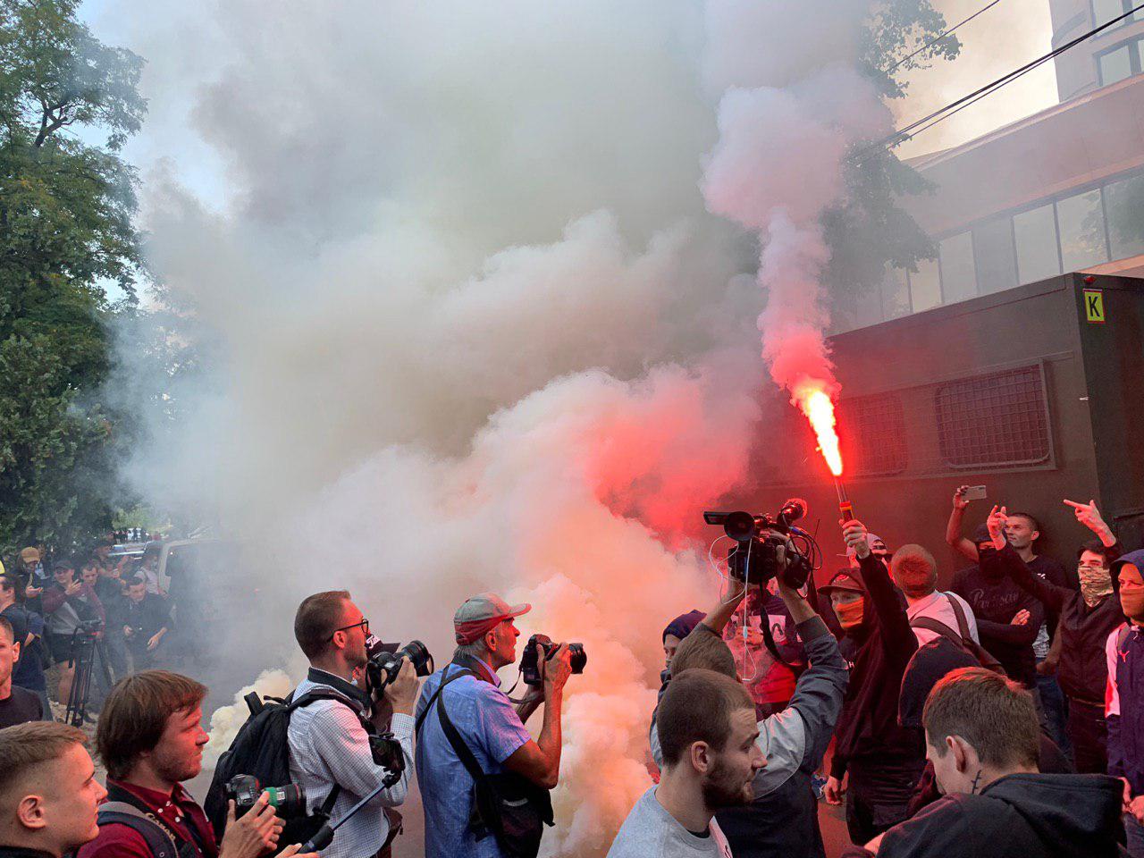 Как сообщает журналист "Страны", у здания канала находятся около трех сотен человек, среди которых члены Нацкорпуса и С14. Националисты жгут фаера, а на территорию комплекса, где расположен телеканал, залетают петарды. На кордоне выстроились бойцы Нацгвардии.