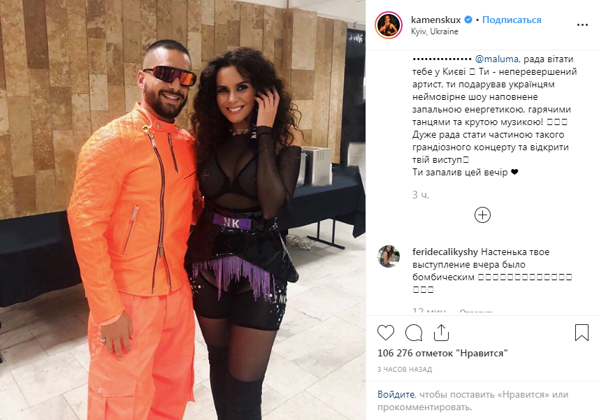 "Maluma, рада приветствовать тебя в Киеве. Ты - непревзойденный артист, ты подарил украинцам невероятное шоу, наполненное зажигательной энергетикой, горячими танцами и крутой музыкой! Очень рада стать частью такого грандиозного концерта и открыть твое выступление. Ты зажег этот вечер", - написала певица.