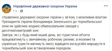 "Управление государственной охраны Украины в связи с возможным визитом президента Украины Владимира Зеленского в Чернобыльскую зону не осуществляет никаких ограничительных мер в десятикилометровой зоне. Завтра, как и в любой другой день, все туристические объекты будут работать в обычном рабочем режиме", - говорится в сообщении УГО на странице в Facebook во вторник.