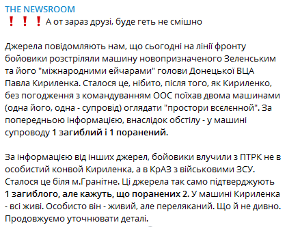 "Источники сообщают нам, что сегодня на линии фронта боевики расстреляли машину вновоназначенного Зеленским и его "международными эйчарами" председателя Донецкой ВГА Павла Кириленко. Произошло это якобы после того, как Кириленко, без согласования с командованием ООС поехал двумя машинами (одна его, одна - сопровождение) осматривать "просторы вселенной". По предварительной информации, в результате обстрела - в машине сопровождения 1 погибший и 1 ранен. По информации от других источников, боевики попали с ПТРК не в личный конвой Кириленко, а в Краз с военными ВСУ. Произошло это около г.Гранитное. Эти источники также подтверждают 1 погибшего, но говорят, что раненых 2. В машине Кириленко - все живы. Лично он - живой, но испуганный. Что и не удивительно. Продолжаем уточнять детали", - сообщил телеграм-канал The Newsroom.