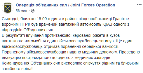 "Сегодня, около 15:00 в районе южной окраины Гранитного вражеским ПТРК был поражен грузовой автомобиль КрАЗ одного из подразделений Объединенных сил. В результате попадания противотанковой управляемой ракеты в кузов грузового автомобиля один военнослужащий погиб. Еще один военнослужащий получил ранения средней тяжести.