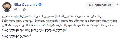 После этих слов совладельцы и партнеры грузинского телеканала Рустави-2 отказались уволить Гварамию, пишет РИА Новости. За отставку Гварамии выступала Нино Нижарадзе - владелица 9-процентной доли в компании. Однако другие акционеры отказались поддержать ее требование. "Это решение не было неожиданным, так как партнеры и сам Гварамия всегда придерживаются единого мнения… Мы считаем, что из-за инцидентов руководство канала должно быть наказано", - заявил ее адвокат.