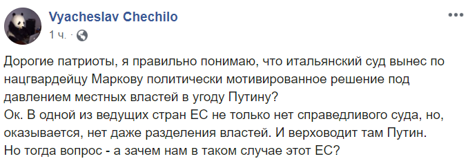 "Дорогие патриоты, я правильно понимаю, что итальянский суд вынес по нацгвардейцу Маркову политически мотивированное решение под давлением местных властей в угоду Путину?