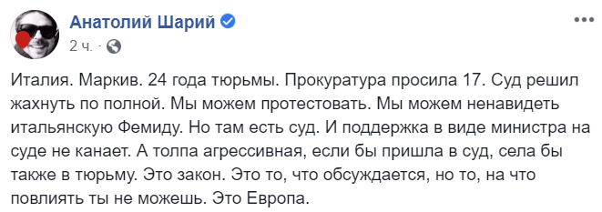 "Италия. Маркив. 24 года тюрьмы. Прокуратура просила 17. Суд решил жахнуть по полной. Мы можем протестовать. Мы можем ненавидеть итальянскую Фемиду. Но там есть суд. И поддержка в виде министра на суде не канает. А толпа агрессивная, если бы пришла в суд, села бы также в тюрьму. Это закон. Это то, что обсуждается, но то, на что повлиять ты не можешь. Это Европа".