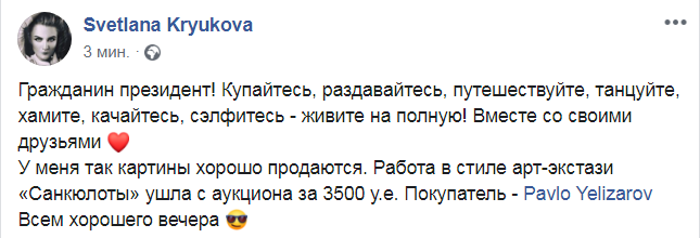 "Гражданин президент! Купайтесь, раздевайтесь, путешествуйте, танцуйте, хамите, качайтесь, сэлфитесь - живите на полную! Вместе со своими друзьями. У меня так картины хорошо продаются", - написала Крюкова в посте об окончании торгов.