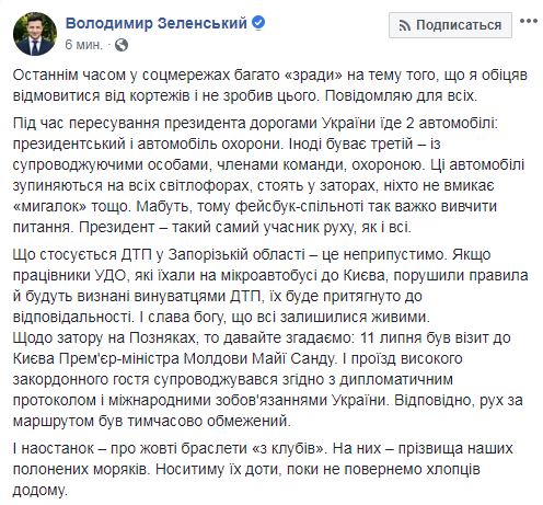 Президент Владимир Зеленский прокомментировал аварию с участием его кортежа под Запорожьем, а также рассказал, зачем он носит желтые браслеты. Об этом он написал в Facebook, разъясняя те вопросы, которые возникли к нему в социальных сетях.