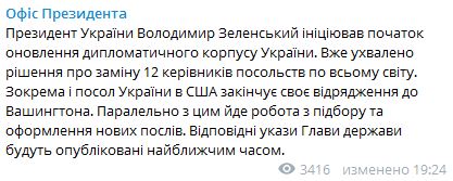 Отмечается, что уже принято решение о замене 12 руководителей посольств по всему миру. В том числе и посол Украины в США заканчивает свою командировку в Вашингтон. "Параллельно с этим идет работа по подбору и оформлению новых послов. Соответствующие указы Главы государства будут опубликованы в ближайшее время", - говорится в сообщении Офиса Президента.