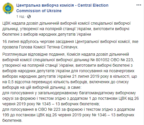 Рассмотрев соответствующее представление, Комиссия предоставила разрешение участковой избирательной комиссии специального избирательного участка № 801052 ОВО № 223, созданной на полярной станции Украины, изготовить избирательные бюллетени по выборам народных депутатов Украины для голосования на внеочередных выборах народных депутатов Украины 21 июля 2019 года в количестве, что на 0,5 процента превышает количество избирателей, включенных в список избирателей на этом избирательном участке, а именно: