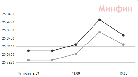 А к 13:00 за доллар давали и просили уже немного меньше: 25,85 (покупка) и 25,88 (продажа).