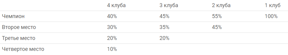 Половина суммы, соответствующей ценности каждого телерынка, будет поделена между клубами в зависимости от результатов в предыдущем национальном чемпионате. Ниже приведена схема распределения.