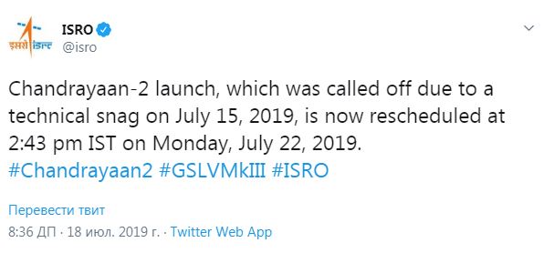 "Запуск миссии "Чандраян-2" (на санскрите - "Лунный корабль" - Прим. Ред.), отмененный из-за технических неполадок 15 июля 2019 года, перенесен на понедельник, 22 июля, в 14.43", - проинформировала ISRO.