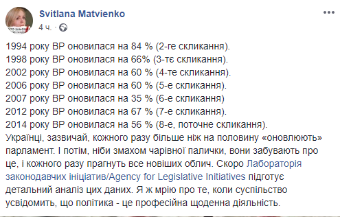Во время выборов в парламент украинские избиратели, как правило, каждый раз более чем на половину "обновляют" Верховную Раду. Об этом сообщила председатель совета Лаборатории законодательных инициатив Светлана Матвиенко на своей странице в Facebook.