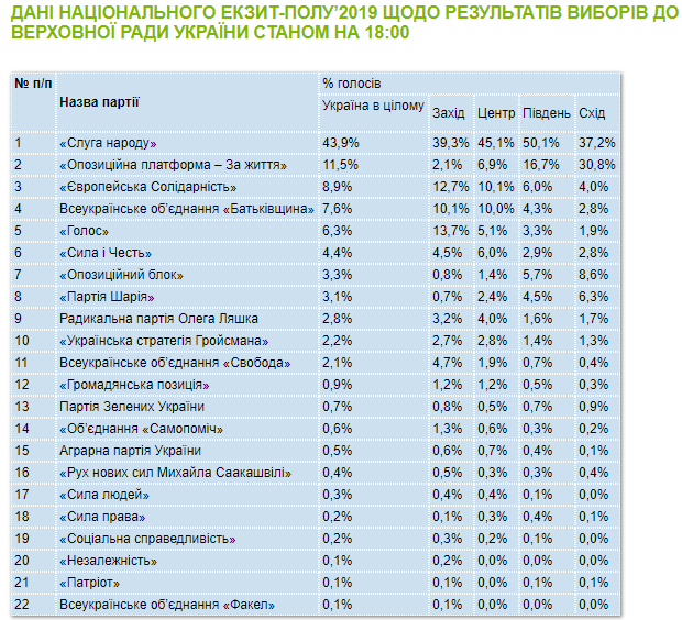 21 июля в Украине прошли досрочные парламентские выборы. Первые данные о ходе голосования, предоставленные Национальным экзитполом, появились в 19:45 (это информация по состоянию на 18:00), окончательные результаты будут в 22:00 (данные на момент закрытия участков).