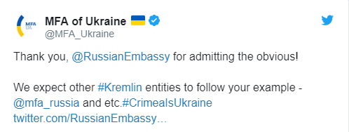 В ответ на неоднозначный пост МИД Украины поблагодарил российское посольство за то, что они признали очевидное (имеется в виду принадлежность Крыма Украине) и заявил, что ожидает, что другие ведомства Кремля, в частности МИД, последуют их примеру.