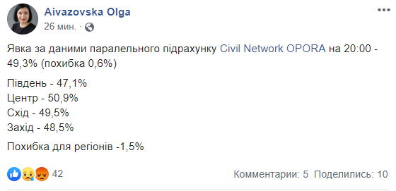 "Явка по данным параллельного подсчета Civil Network OPORA на 20:00 - 49,3% (погрешность 0,6%). Юг - 47,1%; Центр - 50,9%; Восток - 49,5%", Запад - 48,5%", - сообщила Айвазовская в соцсети.