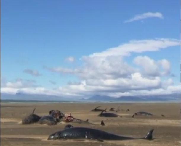 18 июля группа американские туристы вертолета заметили на побережье Исландии 50 черных дельфинов, также известных как гринды. Животные были мертвы, некоторые из них были с ранами.