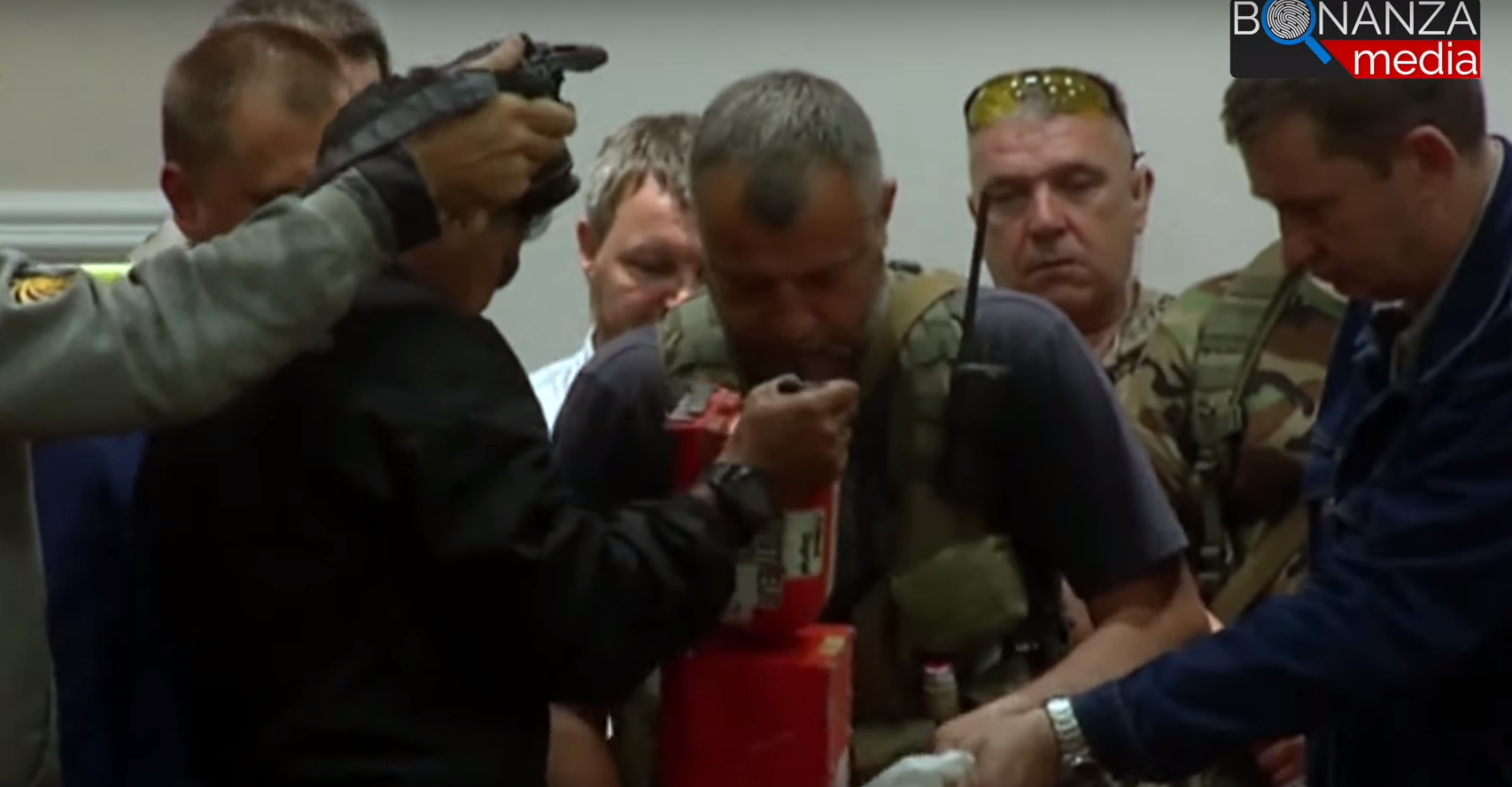 Далее в фильме утверждается, что именно полковник Сакри первым получил "черные ящики" 22 июля 2014 года в Донецке. Видео этой церемонии опубликовано в фильме. На ней присутствует Бородай, Сакри и "черные ящики", которые на самом деле красного цвета.