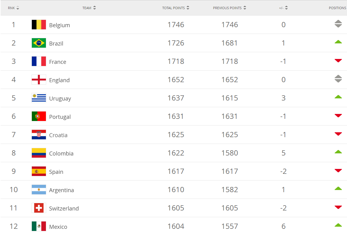Что касается первой десятки, то здесь по-прежнему лидирует сборная Бельгии, а Бразилия вышла на вторую позицию, обогнав чемпионов мира - Францию. Прогресс продемонстрировали и Колумбия с Аргентиной, которые после Кубка Америки оказались в первой десятке, как передает пресс-служба ФИФА.