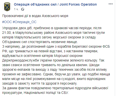 Интересно прозвучало заявление штаба ООС. После ареста судна в Измаиле украинские военные заявили, что корабли береговой охраны ФСБ в Азовском море светят на украинских моряков загадочными зелеными лучами.