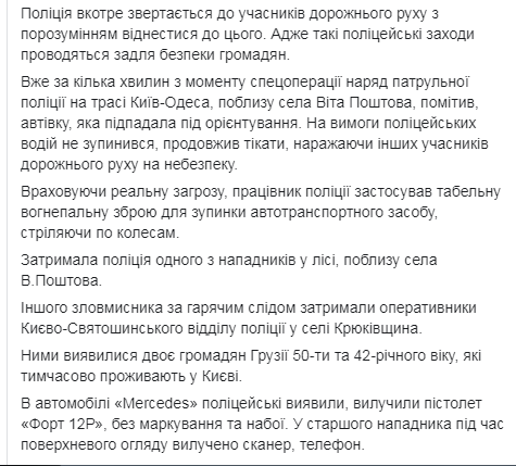 Задержала полиция одного из нападавших в лесу, вблизи села Вита Почтовая. Другого злоумышленника по горячим следам задержали оперативники Киево-Святошинского отдела полиции в селе Крюковка. Ими оказались двое граждан Грузии 50-и и 42-летнего возраста, временно проживающие в Киеве.