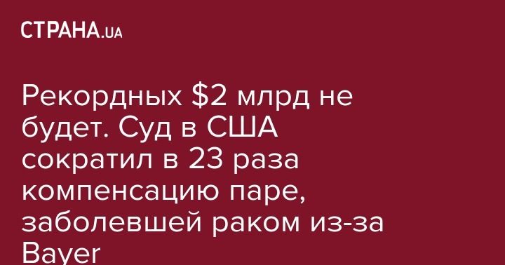 Концерн AG Bayer добился сокращения компенсации с $2 млрд до $86,7 млн., которую ему надлежит выплатить супружеской паре из Калифорнии, заболевшей раком, предположительно, из-за контакта с гербицидом Roundup, пишет The Wall Street Journal.