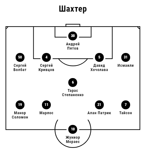 Шахтер (4-1-4-1): Пятов - защитники Болбат, Кривцов, Хочолава, Исмаили – полузащитники Степаненко – Соломон, Марлос, Алан Патрик, Тайсон - нападающий - Мораес.