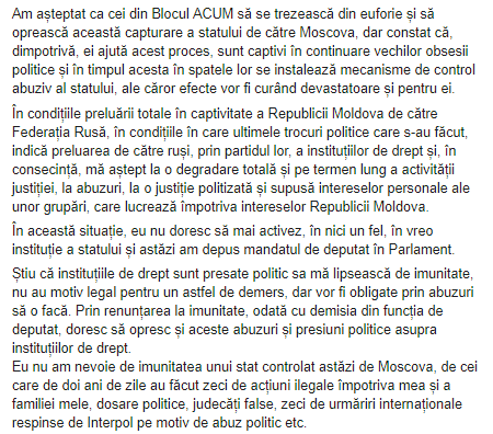 "В нынешней ситуации, когда мандат депутата больше не стоит ничего, я не могу выполнить обязательства перед электоратом в Ниспоренах, перед теми, кто сделал мой мандат наиболее представительным в нынешнем парламенте по количеству голосов. Было бы несправедливо занимать это место до тех пор, пока я не смогу выполнять свой мандат, полученный от них, по причинам, которые не зависят от меня", - написал Плахотнюк.