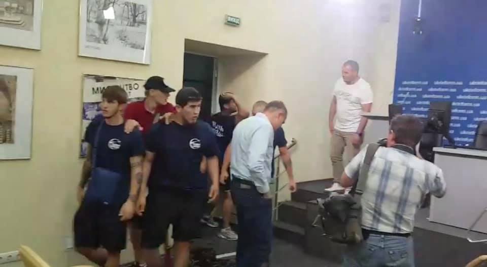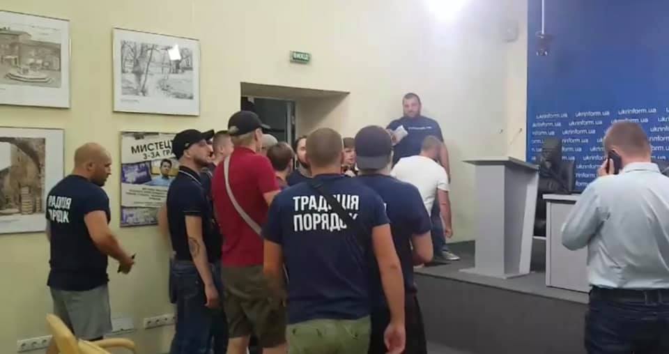 Три человека пострадали в ходе погрома, учиненного группой лиц в футболках общественной организации "Традиция и порядок" в пресс-центре информационного агентства "Укринформ" в Киеве.