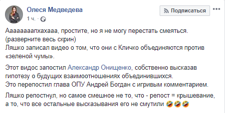 "Ляшко записал видео о том, что они с Кличко объединяются против "зеленой чумы". Этот видос запостил Александр Онищенко, собственно высказав гипотезу о будущих взаимоотношениях объединившихся. Это перепостил глава ОПУ Андрей Богдан с игривым комментарием. Ляшко репостнул, но самое смешное не то, что - репост = крышевание, а то, что все остальные высказывания его не смутили", - написала она.