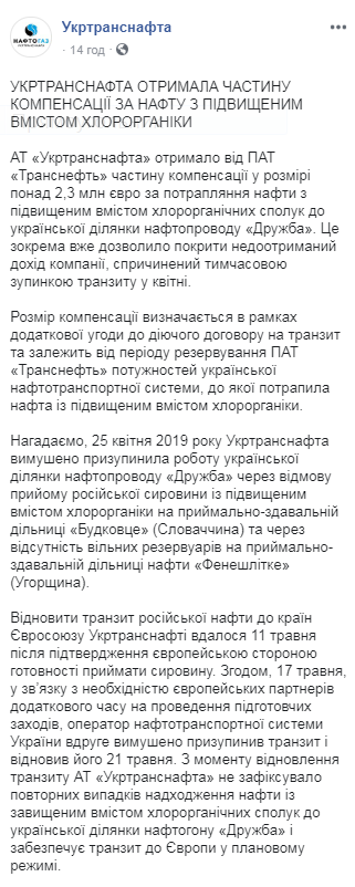 "АО "Укртранснафта" получило от ОАО "Транснефть" часть компенсации в размере 2 300 000 евро за попадание нефти с повышенным содержанием хлорорганических соединений в украинский участок нефтепровода "Дружба". Это, в частности уже позволило покрыть недополученный доход компании, вызванный временной остановкой транзита в апреле.