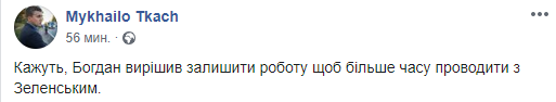 "Говорят Богдан решил оставить работу, чтобы больше времени проводить с Зеленским", - пишет журналист Михаил Ткач.