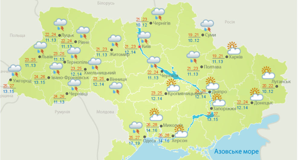 Температура +22...25 на западе, +24...+26 в центре, +22...+24 на Донбассе. На курортах юга +26...+28. Ночью по всей Украине, кроме южных областей, ожидается +10...+15.