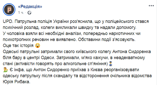 Однако патрульная полиция Украины разъяснила, что у полицейского произошло психическое расстройство. Одесские коллеги вызвали Сидоренко скорую помощь.