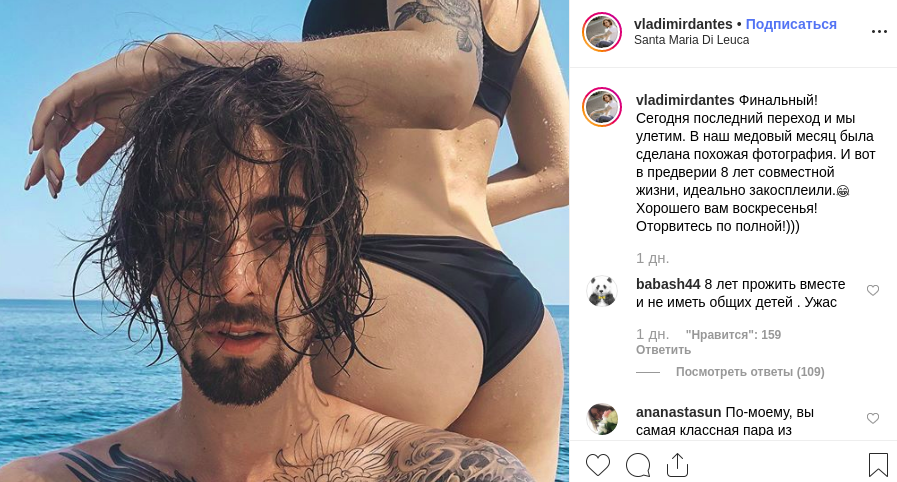 Солистка группы "Время и Стекло" Надя Дорофеева показала ягодицы на совместном снимке с мужем Владимиром Дантесом во время отдыха в Италии. Фото было опубликовано в Instagram Дантеса.