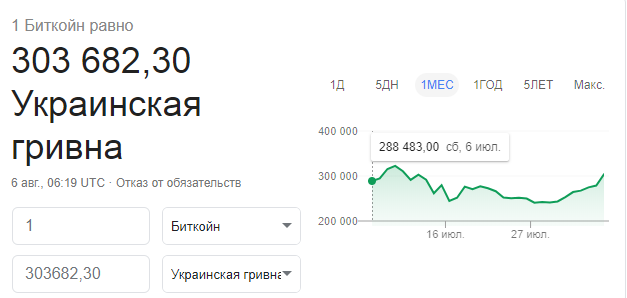 Курс биткоина к гривне с утра такой: 303 682 грн за один биткоин.