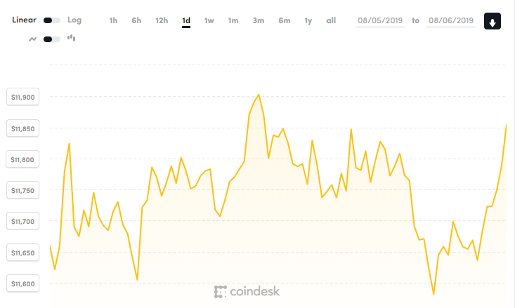 Судя по данным за сутки курс биткоина колебался в пределах $11 600-11 900. Наибольших показателей он достиг к вечеру 5 августа.