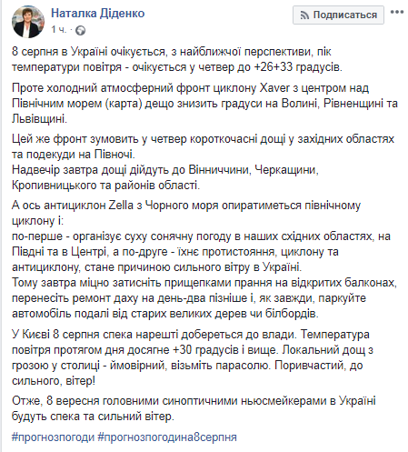 "Итак, 8 августа главными синоптическими ньюсмейкерами в Украине будут жара и сильный ветер", - подытожила Диденко.