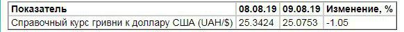 Сегодня, 9 августа, справочный курс гривни к доллару США на межбанковском валютном рынке по состоянию на 12:00 кв укрепился сразу на 27 копеек до 25,08 грн/$1. Об этом сообщает Нацбанк.