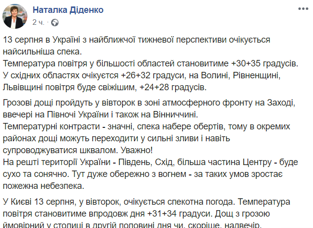 Синоптик ресурса Opogode Наталья Диденко сообщила, что с 13 августа в Украину придет сильная жара. В Киеве температура воздуха достигнет +30...+35 градусов. Во вторник, 13 августа, в столице возможен дождь с грозой - во второй половине дня или вечером.