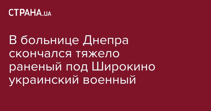 В больнице Днепра скончался военнослужащий Вооруженных сил Украины, который 9 августа был ранен в районе Широкино Донецкой области. Об этом на своей странице в соцсети написал главврач медучреждения Сергей Рыженко.