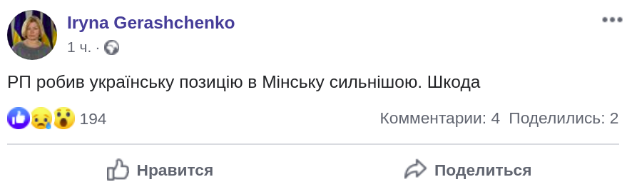 А бывшия представитель Украины в гуманитарной подгруппе ТКГ, избранная народным депутатом Верховной Рады 9-го созыва, Ирина Геращенко в Facebook выразила сожаление в связи с увольнением Безсмертного.