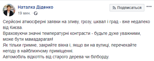 На Киев надвигается серьезный ливень, гроза, шквал и град. Об этом на своей странице в Facebok сообщила синоптик Наталья Диденко.