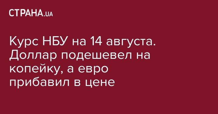 В среду, 14 августа, Национальный банк Украины установил курс гривны по отношению к основным валютам. Доллар, по сравнению с предыдущим днем, подешевел на 1 копейку. Об этом свидетельствует информация на сайте регулятора